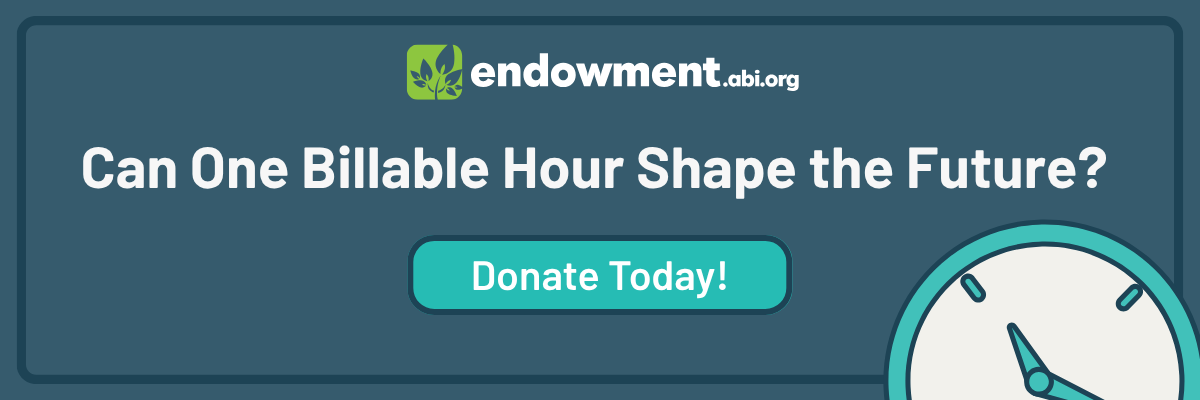 The Give an Hour Campaign invites members to donate the equivalent of one billable hour of their time to the ABI Endowment Fund. It’s a simple way to make a meaningful impact, and every contribution strengthens ABI’s mission and legacy.